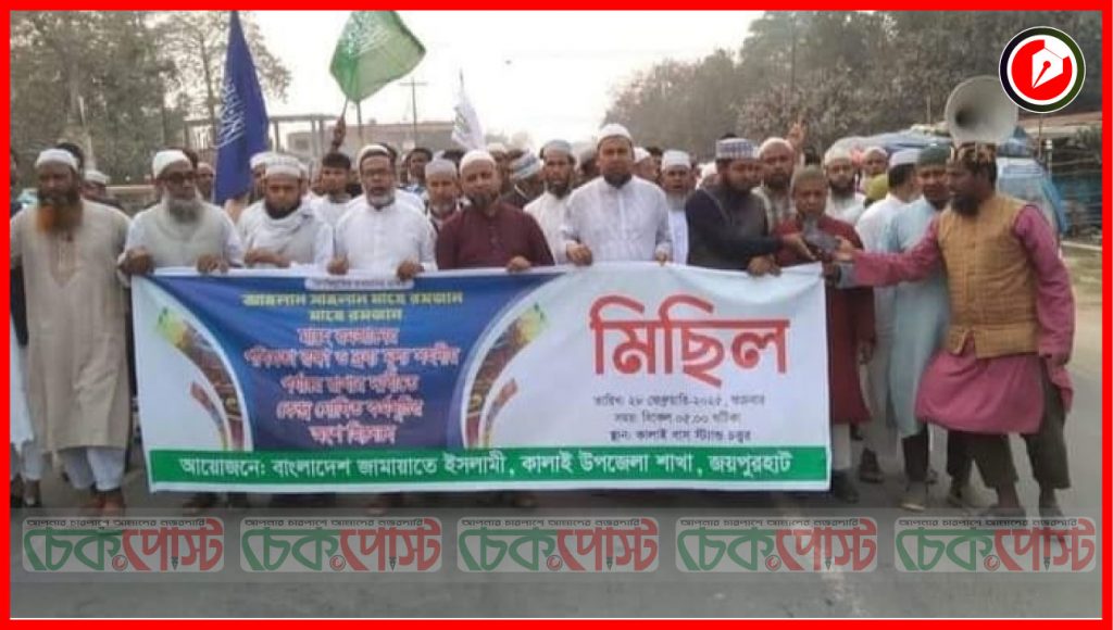 জয়পুরহাটের কালাই উপজেলায় মাহে রমজানের পবিত্রতা রক্ষা ও নিত্যপ্রয়োজনীয় দ্রব্যমূল্য সহনীয় পর্যায়ে রাখার দাবিতে বাংলাদেশ জামায়াতে ইসলামী এক বিক্ষোভ মিছিল ও আলোচনা সভার আয়োজন করে। ২৮ ফেব্রুয়ারি বিকাল ৫টায় উপজেলা কেন্দ্রীয় মডেল মসজিদ চত্বর থেকে মিছিলটি বের হয়ে পৌরসদরের প্রধান প্রধান সড়ক প্রদক্ষিণ করে কালাই বাসস্ট্যান্ডে গিয়ে শেষ হয়।