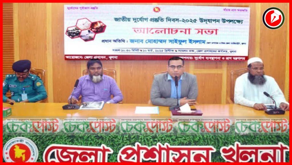 “দুর্যোগের পূর্বাভাস প্রস্তুতি, বাঁচায় প্রাণ ও ক্ষয়ক্ষতি” প্রতিপাদ্যকে সামনে রেখে খুলনায় জাতীয় দুর্যোগ প্রস্তুতি দিবস উপলক্ষ্যে এক আলোচনা সভা অনুষ্ঠিত হয়েছে। ১০ মার্চ সকালে খুলনা জেলা প্রশাসকের সম্মেলন কক্ষে এই সভার আয়োজন করা হয়।