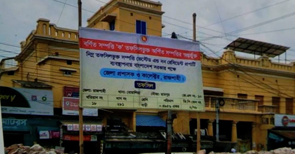 জেলা প্রশাসনের টানানো সাইনবোর্ডে জায়গাটিকে ‘ক’ তফসিলভুক্ত অর্পিত সম্পত্তি (ভেস্টেড অ্যান্ড নন-রেসিডেন্ট প্রপার্টি) হিসেবে উল্লেখ করা হয়েছে। এতে বলা হয়েছে, বাংলাদেশ সরকারের পক্ষে এই সম্পত্তির ব্যবস্থাপনার দায়িত্বে রয়েছেন রাজশাহী জেলা প্রশাসক ও কালেক্টর। জেলা প্রশাসনের টানানো ওই সাইনবোর্ডে উল্লিখিত তফসিল অনুযায়ী সম্পত্তিটির বিস্তারিত তথ্য দেওয়া হয়েছে। এর মাধ্যমে কুমারপাড়ায় অবস্থিত মহানগর আওয়ামী লীগের ওই পরিত্যক্ত জায়গাটি আনুষ্ঠানিকভাবে সরকারি সম্পত্তি হিসেবে জেলা প্রশাসনের প্রকাশ্য নিয়ন্ত্রণে এলো।