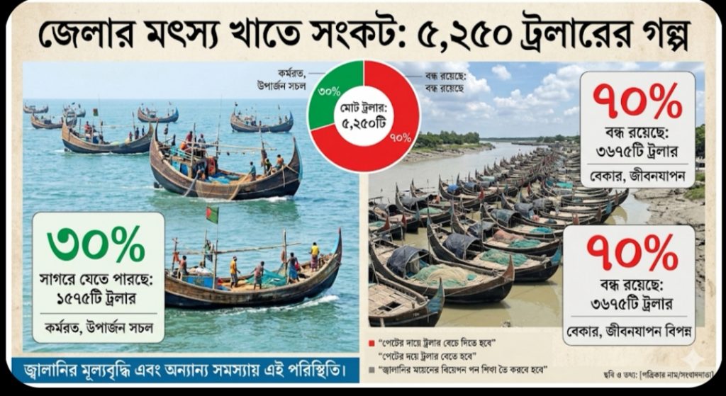 কক্সবাজারে ৭০% ট্রলার বন্ধ: তেল সংকট ও নিরাপত্তাহীনতায় বিপাকে ৫ হাজার জেলে পরিবার
