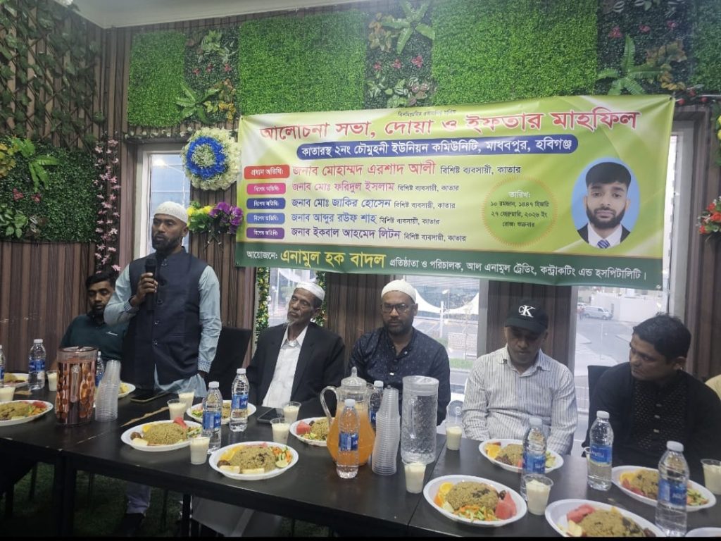 কাতারে বসবাসরত হবিগঞ্জের মাধবপুর উপজেলার চৌমুহনী ইউনিয়নের প্রবাসীদের সম্মানার্থে এনামুল ট্রেডিং, কন্ট্রাকটিং এন্ড হসপিটালিটির প্রতিষ্ঠাতা ও পরিচালক এনামুল হক বাদলের উদ্যোগে আলোচনা, দোয়া ও ইফতার মাহফিল অনুষ্ঠিত হয়েছে।