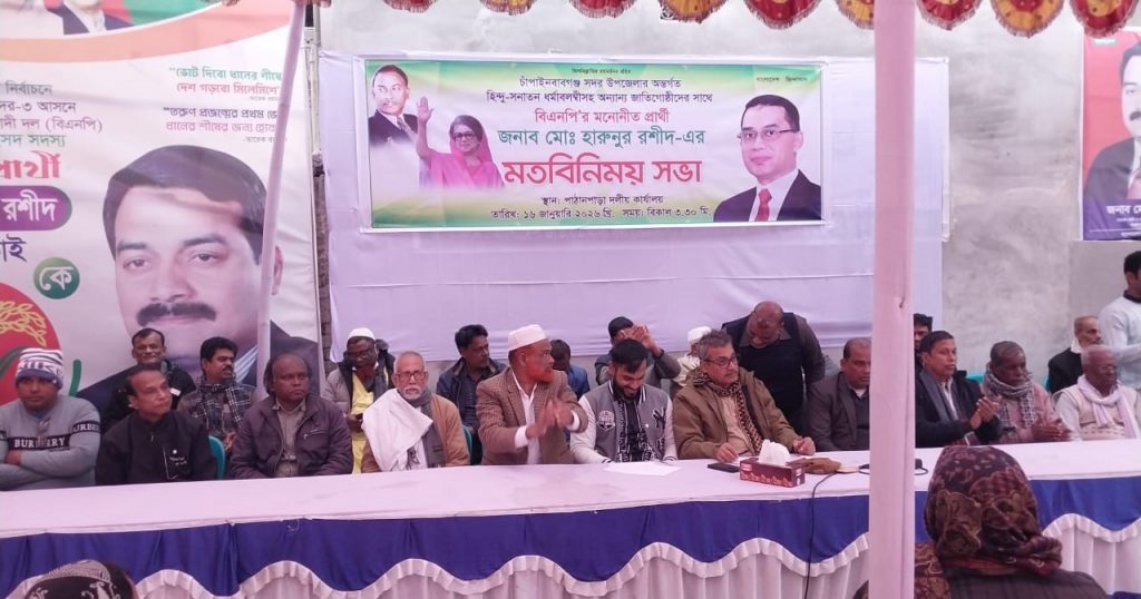 চাঁপাইনবাবগঞ্জ সদর উপজেলায় হিন্দু–সনাতন ধর্মাবলম্বীসহ বিভিন্ন জাতিগোষ্ঠীর মানুষের সঙ্গে এক বিশেষ মতবিনিময় সভা করেছেন বিএনপি মনোনীত প্রার্থী মো. হারুনুর রশীদ।