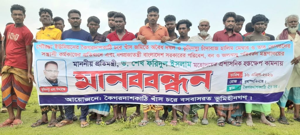 বাগেরহাটের রামপালের কৈগরদাশকাঠি চরের খাস জমি দখল, ভূমিদস্যুতা ও চাঁদাবাজির অভিযোগে মানববন্ধন করা হয়েছে। বৃহস্পতিবার (১৬ এপ্রিল) গৌরম্ভা ইউনিয়নের কৈগরদাসকাঠির স্থানীয় ভূমিহীনদের উদ্যোগে এক বিশাল মানববন্ধন পালন করা হয়। এ সময় খাস চরে বসবাসরত প্রায় পাঁচ শতাধিক নারী-পুরুষসহ বিভিন্ন শ্রেণি-পেশার মানুষ এ মানববন্ধনে অংশ নেন।