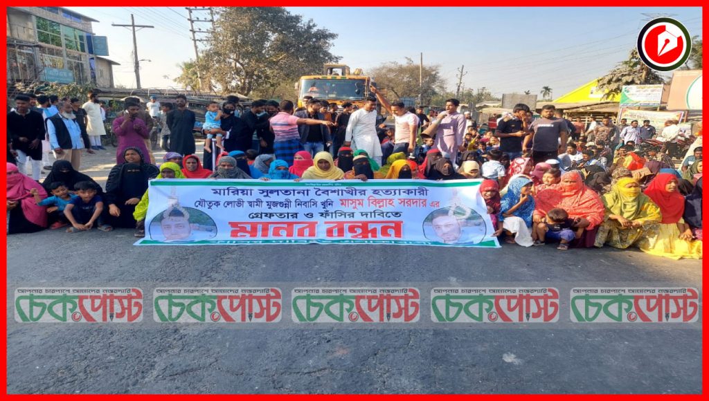 খুলনায় মারিয়া সুলতানা বৈশাখীর হত্যাকারী যৌতুক লোভী স্বামী মাসুম বিল্লাহ সরদার ও তার মা নুরজাহান বেগমের গ্রেফতার ও ফাঁসির দাবিতে ৭ ফেব্রুয়ারি শুক্রবার বিকেল ৩ থেকে পাঁচটা পর্যন্ত মোস্তর মোড় বাইপাস সড়ক অবরোধ করে