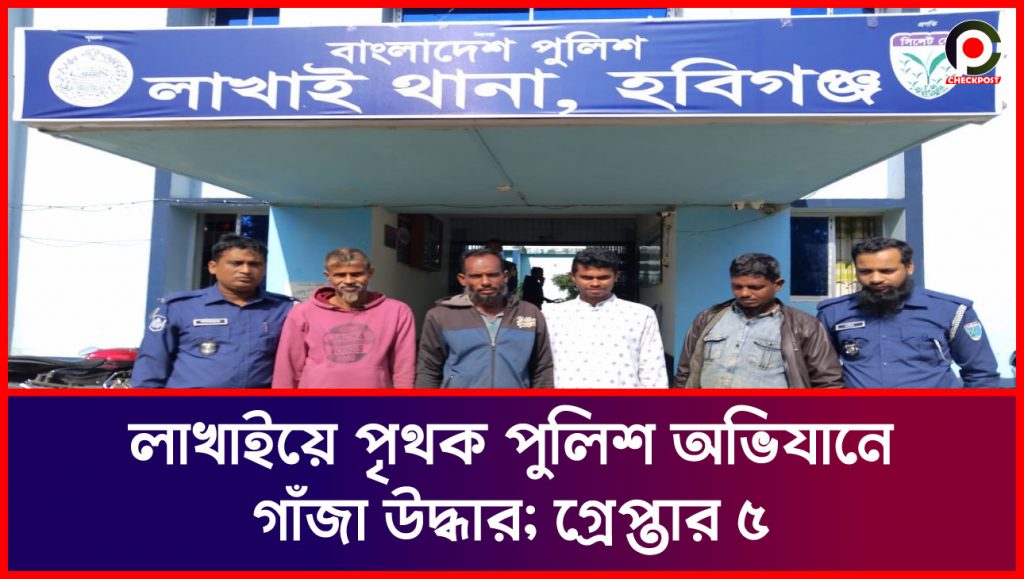 লাখাইয়ে পৃথক পুলিশ অভিযানে গাঁজা উদ্ধার; গ্রেপ্তার ৫