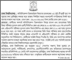 আবেদন ফি: রেজিস্ট্রার, ঢাকা বিশ্ববিদ্যালয় এর অনুকূলে ৭৫০ টাকা ব্যাংক ড্রাফট অথবা পে-অর্ডার করতে হবে। আবেদনপত্রের সঙ্গে অবশ্যই টাকা জমার রশিদ পাঠাতে হবে।