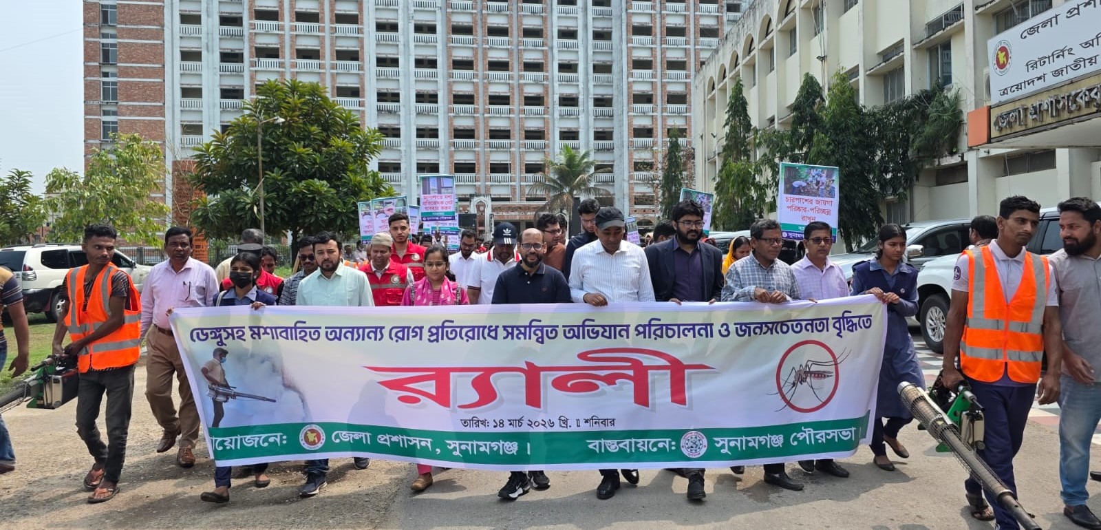 ডেঙ্গুসহ মশাবাহিত অন্যান্য রোগের প্রকোপ রোধে জনসচেতনতা বৃদ্ধির লক্ষ্যে সুনামগঞ্জে একটি বর্ণাঢ্য র্যালি অনুষ্ঠিত হয়েছে। শনিবার (১৪ মার্চ)