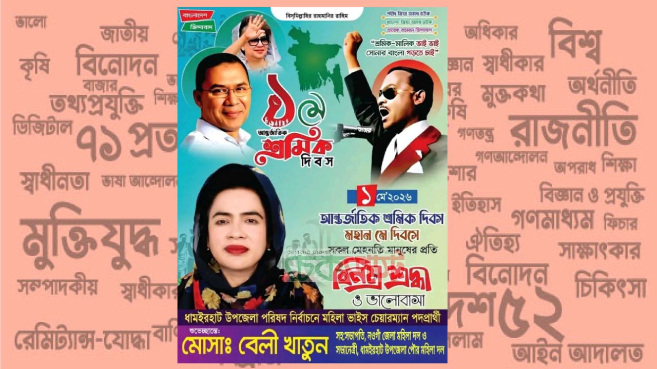 ঐতিহাসিক মহান মে দিবস উপলক্ষে নওগাঁর ধামইরহাট উপজেলার সর্বস্তরের জনগণকে শুভেচ্ছা জানিয়েছেন আসন্ন উপজেলা পরিষদ নির্বাচনে মহিলা ভাইস চেয়ারম্যান পদপ্রার্থী বেলী খাতুন।