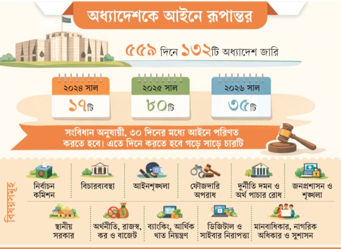আইন মন্ত্রণালয়ের হিসাব অনুযায়ী, জুলাই গণ-অভ্যুত্থানে ২০২৪ সালের ৫ আগস্ট আওয়ামী লীগ সরকার ক্ষমতাচ্যুত হওয়ার পর ওই বছরের ৮ আগস্ট দায়িত্ব নেয় অন্তর্বর্তী সরকার। দায়িত্ব নেওয়ার পর অন্তর্বর্তী সরকার ওই বছরে ১৭টি, ২০২৫ সালে ৮০টি এবং ২০২৬ সালের ১৭ ফেব্রুয়ারি প্রধানমন্ত্রী তারেক রহমানের নেতৃত্বে নতুন সরকার শপথ নেওয়ার আগে পর্যন্ত ৩৫টি অধ্যাদেশ জারি করে। নির্বাচন কমিশন, বিচারব্যবস্থা, আইনশৃঙ্খলা, ফৌজদারি অপরাধ, দুর্নীতি দমন, অর্থ পাচার, জনপ্রশাসন ও শৃঙ্খলা, স্থানীয় সরকার, অর্থনীতি, রাজস্ব, কর ও বাজেট, ব্যাংকিং, আর্থিক খাত ও নিয়ন্ত্রণ, ডিজিটাল ও সাইবার নিরাপত্তা, মানবাধিকার, নাগরিক অধিকার ও সুশাসন বিষয়ে এসব অধ্যাদেশ জারি করা হয়।