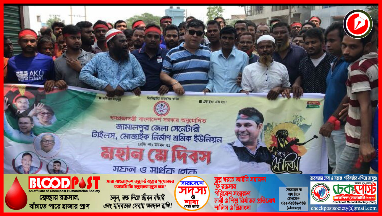 আন্তর্জাতিক শ্রমিক দিবস ও মহান মে দিবস উপলক্ষে জামালপুরে র্যালি অনুষ্ঠিত হয়েছে। বুধবার (১ মে) সকালে বাংলাদেশ সরকার অনুমোদিত জামালপুর জেলা স্যানেটারি, টাইলস ও মোজাইক নির্মাণ শ্রমিক ইউনিয়ন (রেজি: ময়মনসিংহ-২১) আয়োজিত র্যালিটি প্রধান কার্যালয়ের সামনে থেকে শুরু হয়ে শহরের লম্বাগাছ ফ্লাইওভারের নিচ দিয়ে অগ্রসর হয়ে দলীয় কার্যালয়ে গিয়ে শেষ হয়।