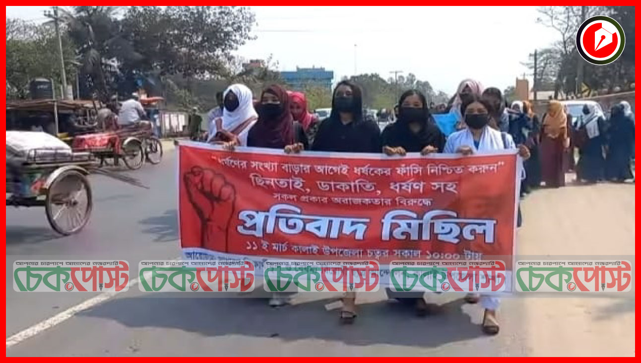 দেশে বিভিন্ন স্থানে ছিনতাই, চুরি, ডাকাতি, ধর্ষণসহ সব ধরনের অরাজকতা বৃদ্ধি পাওয়ার প্রতিবাদে এবং ধর্ষকদের ফাঁসি নিশ্চিত করা ও দ্রুত আইনের আওতায় এনে দেশের অরাজকতা বন্ধ করার দাবিতে কালাই উপজেলা চত্বরে প্রতিবাদ মিছিল অনুষ্ঠিত হয়েছে।