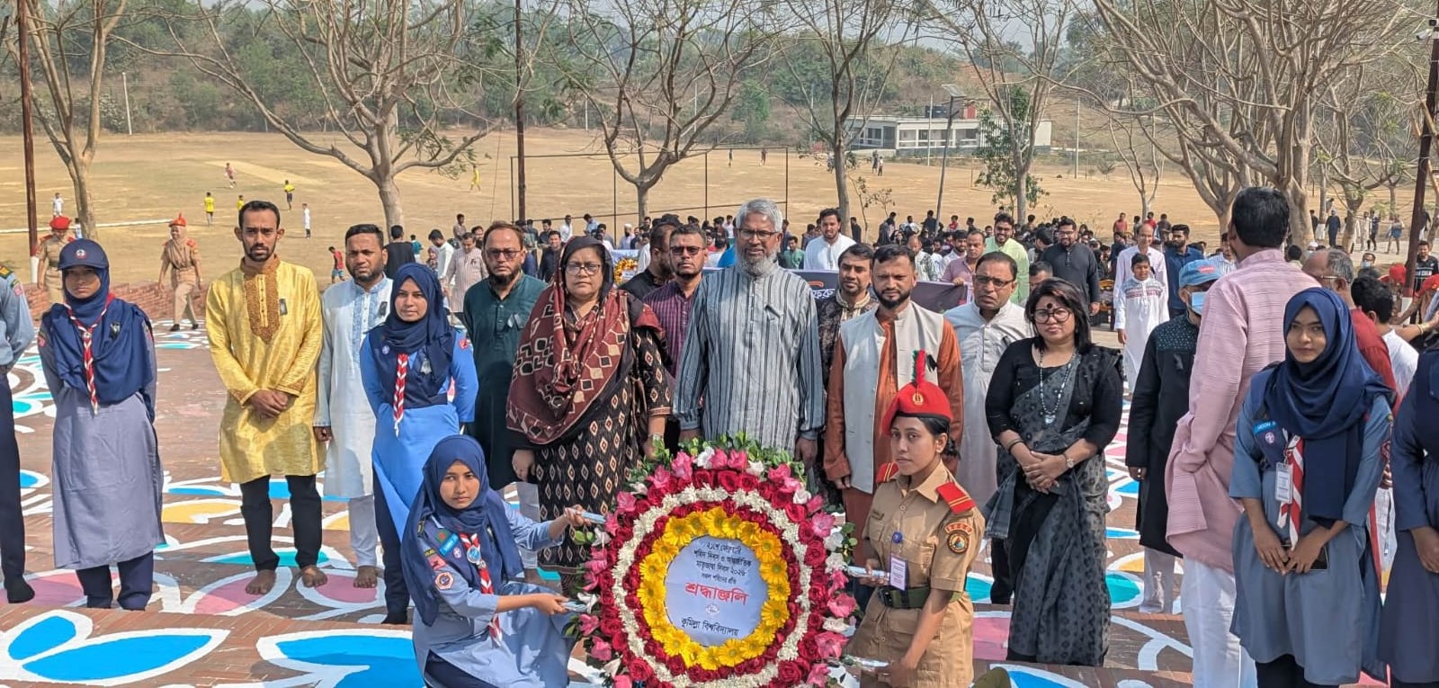 শনিবার (২১শে ফেব্রুয়ারি) সকাল ১০টায় বিশ্ববিদ্যালয়ের কেন্দ্রীয় শহিদ মিনারে ভাষা শহিদদের স্মরণে ফুল দিয়ে গভীর শ্রদ্ধা জানানো হয়।