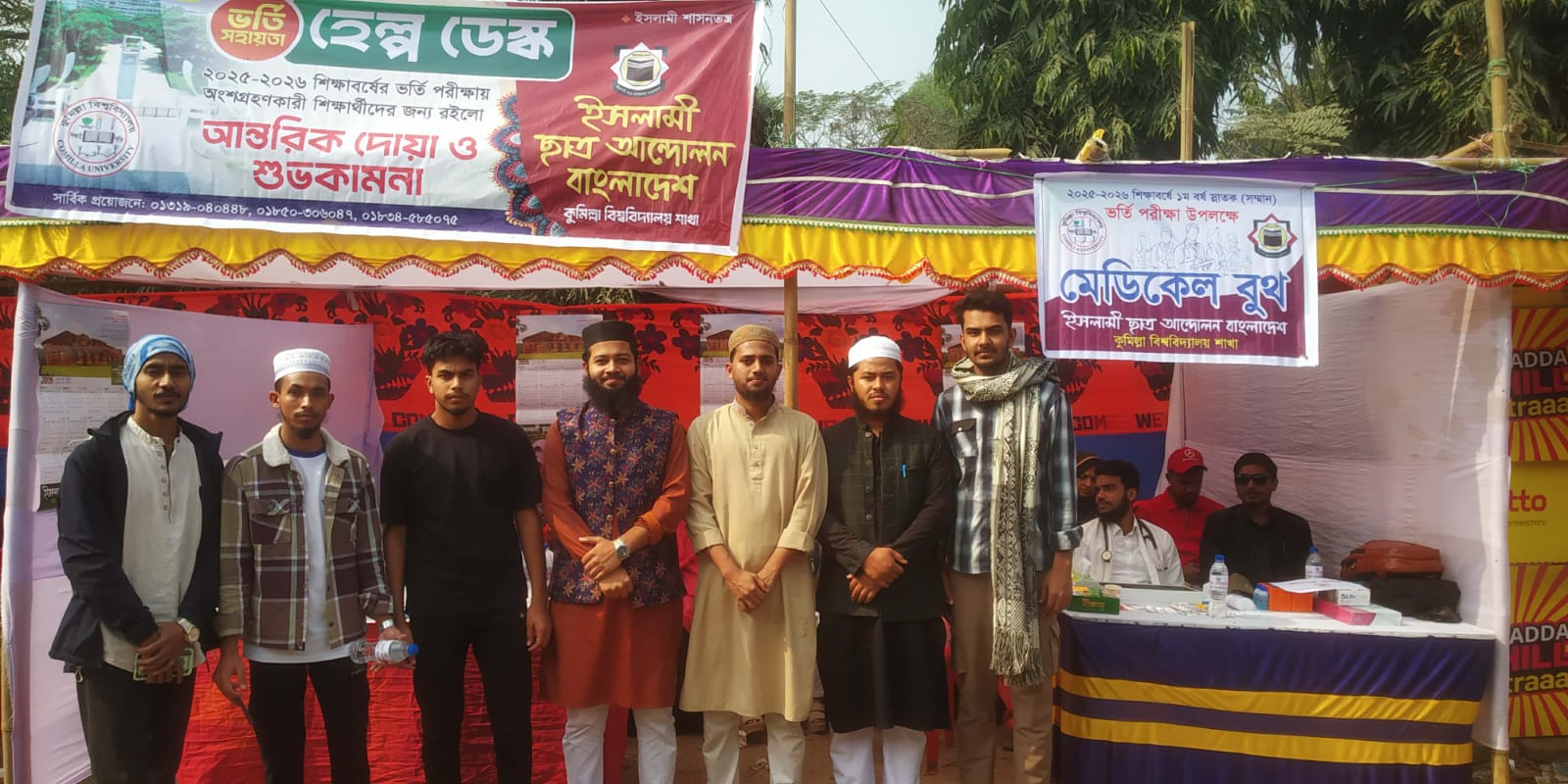 কুমিল্লা বিশ্ববিদ্যালয়ে (কুবি) ২০২৫-২০২৬ শিক্ষাবর্ষের 'এ' ভর্তি পরীক্ষায় অংশ নিতে আসা শিক্ষার্থীদের সহযোগিতায় বিনামূল্যে মেডিকেল সেবা এবং ভর্তি সহায়তা কার্যক্রম পরিচালনা করেছে ইসলামী ছাত্র আন্দোলন বাংলাদেশ, কুমিল্লা বিশ্ববিদ্যালয় শাখা।