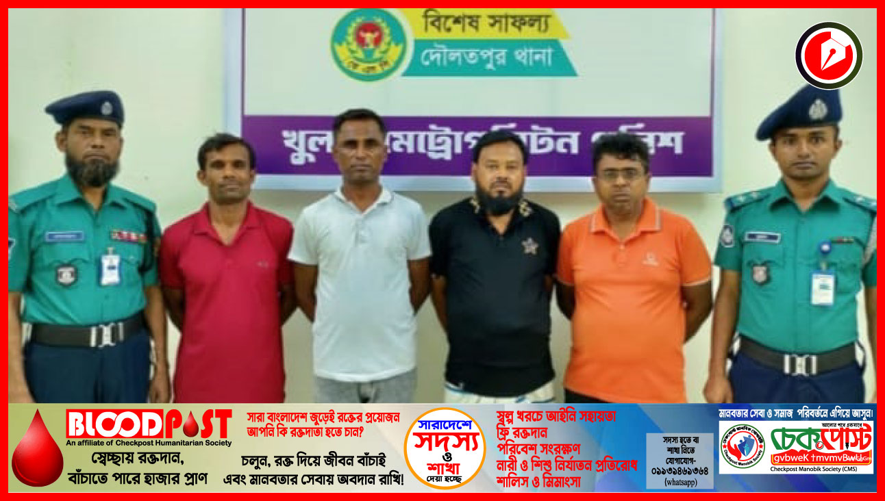 আটককৃতরা হলেন-খালিশপুর নয়াবাটির মরহুম হোসনে শেখে ছেলে হারুন শেখ (৪০), একই গ্রামের মরহুম মোফাজ্জল গাজীর ছেলে লিটন গাজী (৫৭), চিত্রালী বাজার এলাকার মরহুম আশরাফ আলী মোড়লের ছেলে নাসির (৪৫), হাউজিং বাজার এলাকার মো: আবুল বাশারের ছেলে রুবেল (৪৫)।