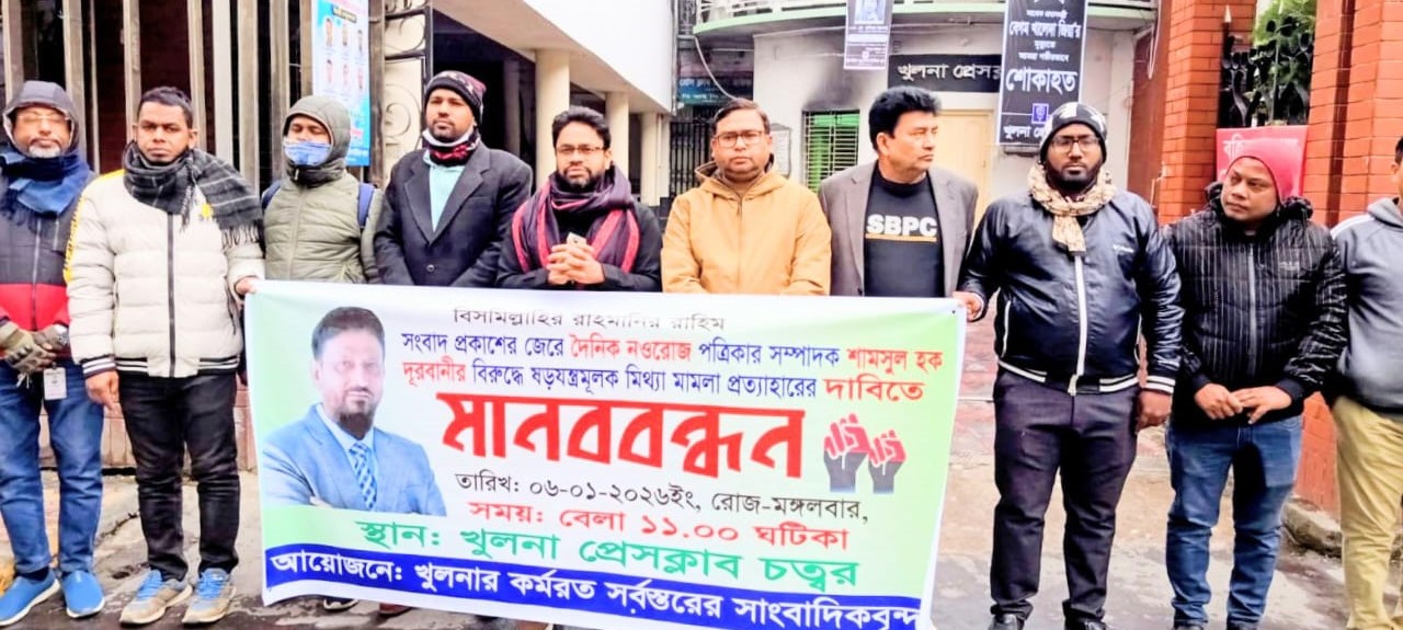 দৈনিক নওরোজ পত্রিকার সম্পাদক শামসুল হক দূরবানী–র বিরুদ্ধে দায়ের করা ষড়যন্ত্রমূলক ও মিথ্যা মামলা প্রত্যাহার এবং তাঁর নিঃশর্ত মুক্তির দাবিতে খুলনায় মানববন্ধন অনুষ্ঠিত হয়েছে।