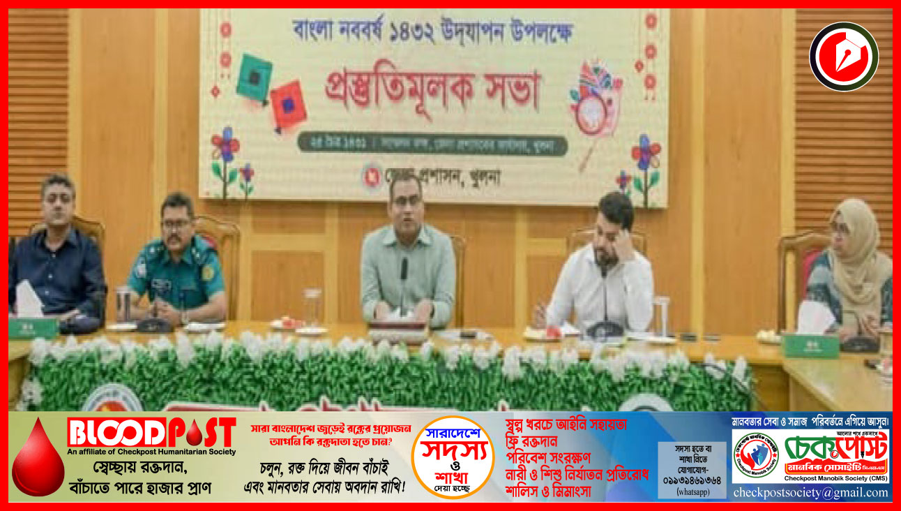 খুলনায় পহেলা বৈশাখ উদযাপন উপলক্ষ্যে এক প্রস্তুতি সভা আজ ৮ এপ্রিল সকালে খুলনা জেলা প্রশাসক মোহাম্মদ সাইফুল ইসলামের সভাপতিত্বে জেলা প্রশাসকের সম্মেলন কক্ষে অনুষ্ঠিত হয়।
