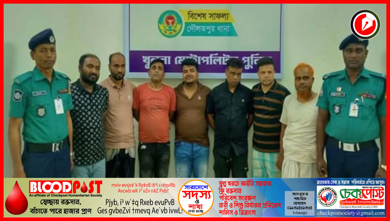 আটককৃতরা হলেন—ফুলতলা বাজার এলাকার মৃত মান্নান শেখের ছেলে সাধীন শেখ, কাশেম শেখ (২৬); পূর্ব বানিয়াখামার এলাকার মৃত শেখ শামসুর রহমানের ছেলে আনোয়ার হোসেন আনু (৪২); নড়াইল জেলার কালিয়া থানার খড়োলিয়া গ্রামের মৃত বিসারত বিশ্বাসের ছেলে জাকির হোসেন (৪৮); খুলনার দিঘলিয়া উপজেলার চন্দনীমহল গাজী পাড়ার মো. ইস্রাফিল গাজীর ছেলে পলাশ গাজী (৩৫); খুলনা সদরের নিক্সন মার্কেট এলাকার মৃত রাজা মুন্সির ছেলে খাঞ্জু মুন্সি (৩৮); সোনাডাঙ্গার বয়রা বাজার এলাকার মৃত শেখ শেরআলীর ছেলে শেখ আবু তালেব (৩৬) এবং দৌলতপুর মহেশ্বরপাশা এলাকার মৃত ইসমাইল গাজীর ছেলে শাহ আলম গাজী (৫২)।