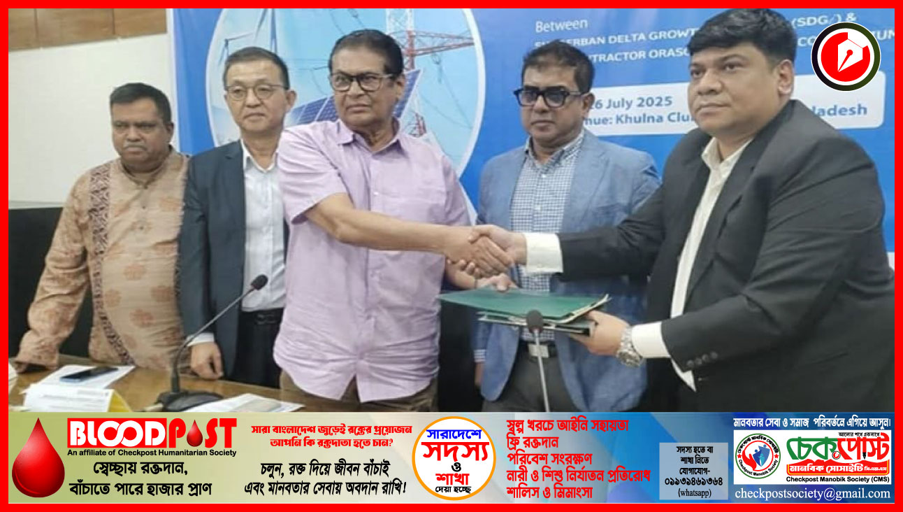 খুলনায় ৬০০ মেগাওয়াট ক্ষমতাসম্পন্ন সৌর বিদ্যুৎ প্রকল্প বাস্তবায়নে সমঝোতা চুক্তি স্বাক্ষর হয়েছে। গতকাল (২৬ জুলাই) খুলনা ক্লাবে সুন্দরবন ডেল্টা উন্নয়ন উদ্যোগ (SDGI) এবং আরব কন্ট্রাক্টর-ওরাসকম পেনিনসুলা কনসোর্টিয়ামের মধ্যে এ চুক্তি স্বাক্ষরিত হয়।