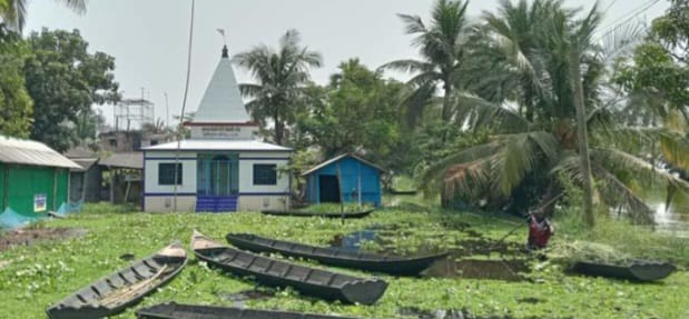 দেখলে মনে হবে কোনো নৌকা ঘাট। কিন্তু আসলে এটি একটি পূজামণ্ডপ। দীর্ঘ দুই মাস ধরে পানিবন্দি হয়ে আছে খুলনার ডুমুরিয়া উপজেলার কৃঞ্চনগর সার্বজনীন হরিগুরু পুজা মন্দির। নিয়মিত পূজা-অর্চনা বিঘ্নিত হচ্ছে সেখানে। শুধু এই মন্দির নয়, আরও ৩টি মন্দির একই অবস্থায় থাকায় এ বছর সেখানে দুর্গাপূজা অনুষ্ঠিত হচ্ছে না।