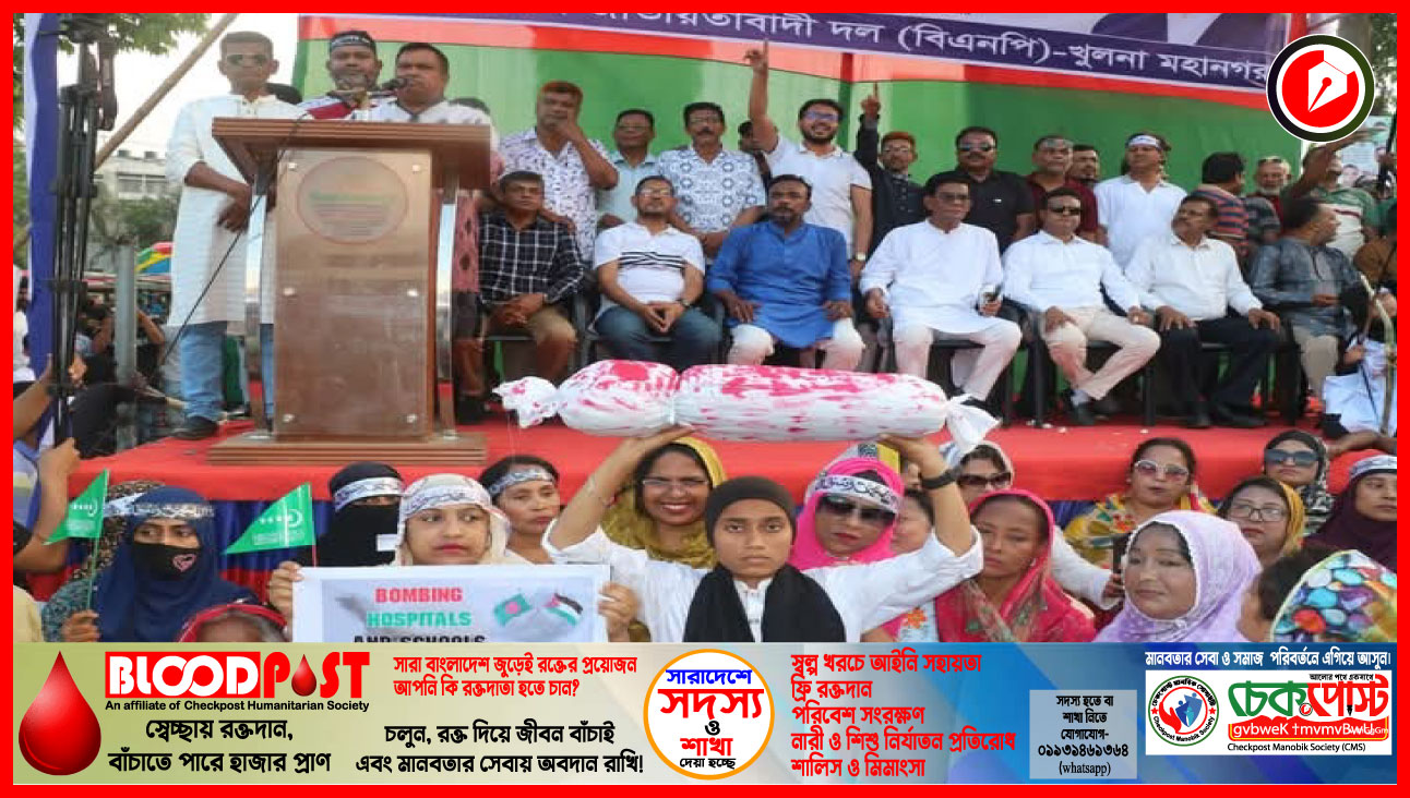 ফিলিস্তিনে ইসরায়েলি হামলা ও গণহত্যার প্রতিবাদে খুলনায় র্যালি ও প্রতিবাদ সমাবেশ করেছে মহানগর বিএনপি। শুক্রবার (১১ এপ্রিল) বিকেলে বিএনপির ভারপ্রাপ্ত চেয়ারম্যান তারেক রহমানের আহ্বানে এই কর্মসূচির আয়োজন করে দলটি।