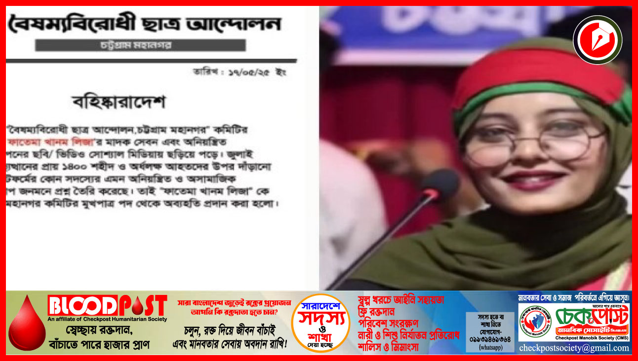 সাংগঠনিক শৃঙ্খলা ভঙ্গের অভিযোগে বৈষম্যবিরোধী ছাত্র আন্দোলন চট্টগ্রাম মহানগরের মুখপাত্র ফাতেমা খানম লিজাকে অব্যাহতি দেওয়া হয়েছে। শনিবার (১৭ মে) আহ্বায়ক আরিফ মহিউদ্দিন ও সদস্য সচিব নিজাম উদ্দিন স্বাক্ষরিত এক বিজ্ঞপ্তিতে এই তথ্য জানানো হয়।