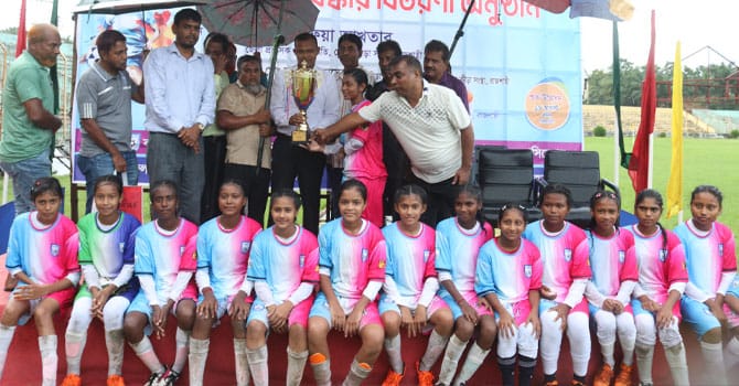 ফাইনাল শেষে রাজশাহী জেলা ফুটবল এসোসিয়েশনের কোষাধ্যক্ষ সিরাজুল ইসলাম সিরাজের সভাপতিত্বে প্রধান অতিথি হিসেবে উপস্থিত থেকে অতিরিক্ত জেলা প্রশাসক (সার্বিক) মির্জা ইমাম উদ্দিন চ্যাম্পিয়ন দলের হাতে ট্রফি তুলে দেন।
