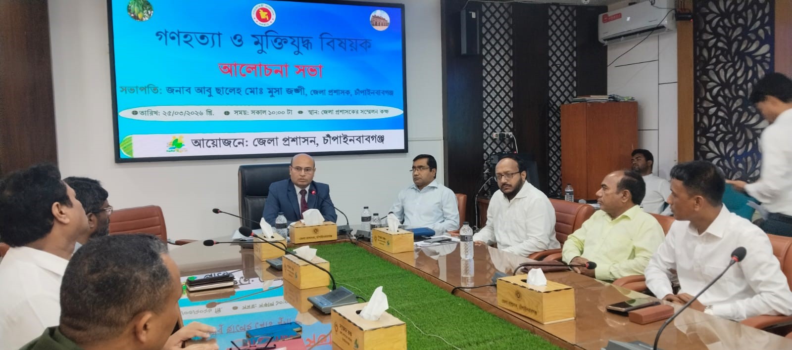 চাঁপাইনবাবগঞ্জে যথাযোগ্য মর্যাদায় ২৫ মার্চ গণহত্যা দিবস পালিত হয়েছে। দিবসটি উপলক্ষে জেলা প্রশাসনের উদ্যোগে গণহত্যা ও মুক্তিযুদ্ধ বিষয়কের আলোচনা সভা অনুষ্ঠিত হয় । বুধবার (২৫ মার্চ) সকাল ১০টায় জেলা প্রশাসকের সম্মেলন কক্ষে জেলা প্রশাসক আবু ছালেহ মোঃ মুসা জঙ্গীর সভাপতিত্বে গণহত্যা ও মহান মুক্তিযুদ্ধ বিষয়ক এক আলোচনা সভা অনুষ্ঠিত হয়।