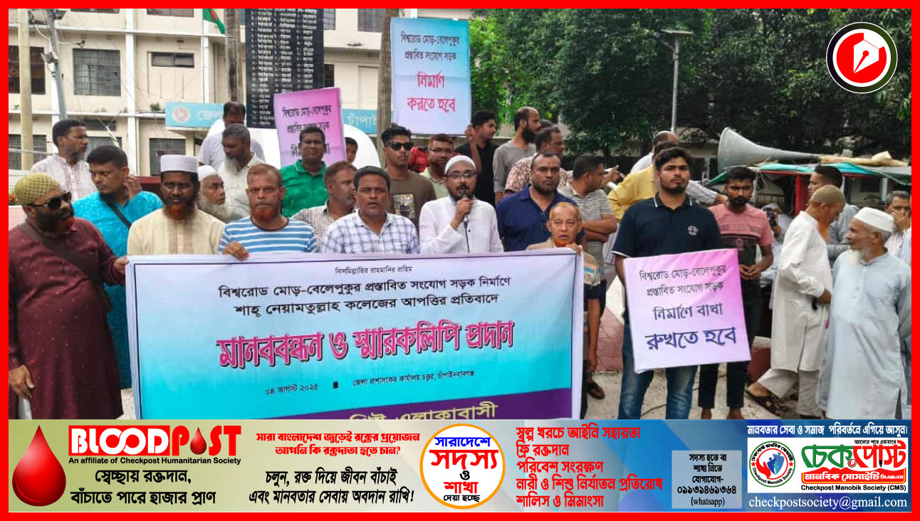 চাঁপাইনবাবগঞ্জ শহরের বিশ্বরোড মোড়–বেলেপুকুর সংযোগ সড়ক নির্মাণে শাহ্ নেয়ামতুল্লাহ কলেজ কর্তৃপক্ষের আপত্তির প্রতিবাদে মানববন্ধন ও স্মারকলিপি প্রদান করেছে এলাকাবাসী।