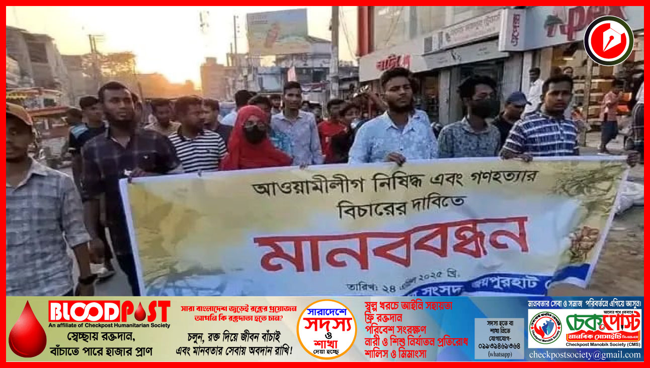 আওয়ামী লীগকে নিষিদ্ধ এবং গণহত্যার বিচার দাবিতে জয়পুরহাটে বিক্ষোভ মিছিল ও মানববন্ধন কর্মসূচি পালন করেছে বাংলাদেশ গণতান্ত্রিক ছাত্র সংসদ জয়পুরহাট জেলা শাখা।