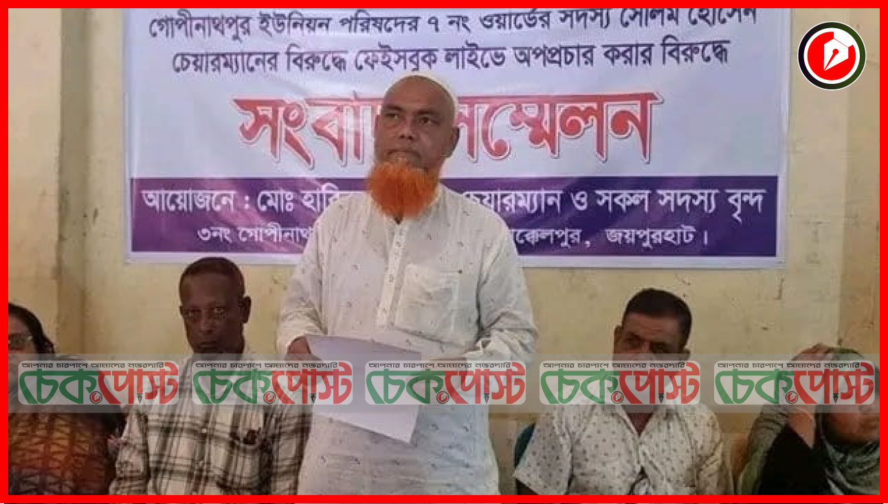 জয়পুরহাটের আক্কেলপুরের গোপীনাথপুর ইউনিয়ন পরিষদের সদস্য সেলিম হোসেন সামাজিক যোগাযোগ মাধ্যমে চেয়ারম্যানের বিরুদ্ধে ফেসবুক লাইভে মিথ্যা অপপ্রচার করার প্রতিবাদে সংবাদ সম্মেলন করেছেন ওই ইউনিয়ন পরিষদের চেয়ারম্যান ও বিএনপি নেতা হাবিবুর রহমান।