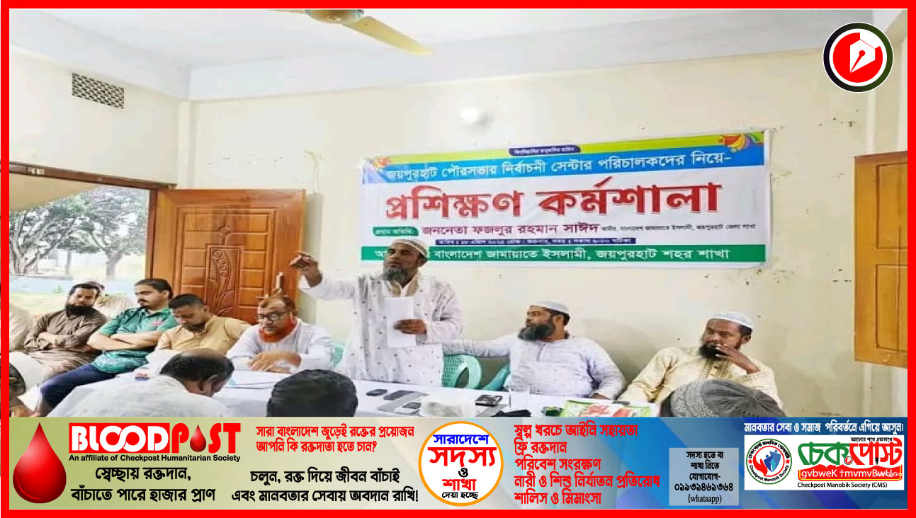 জয়পুরহাট শহর শাখার উদ্যোগে আসন্ন পৌরসভা নির্বাচন উপলক্ষে বাংলাদেশ জামায়াতে ইসলামীর সেন্টার পরিচালকদের নিয়ে প্রশিক্ষণ কর্মশালা অনুষ্ঠিত হয়েছে।