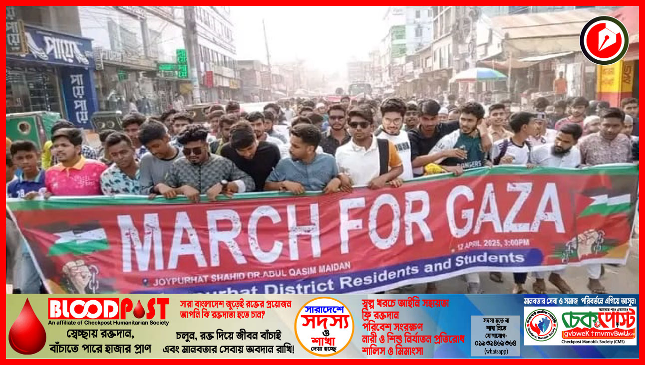 ফিলিস্তিনের গাজায় ইসরায়েলের গণহত্যার প্রতিবাদ ও তা বন্ধের দাবিতে ‘মার্চ ফর গাজা’ কর্মসূচির অংশ হিসেবে জয়পুরহাটে বিক্ষোভ মিছিল ও প্রতিবাদ সমাবেশ অনুষ্ঠিত হয়েছে।