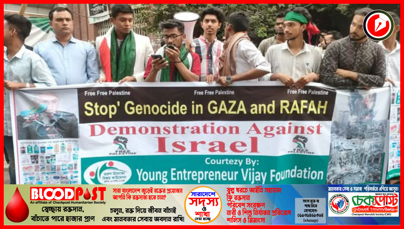 ফিলিস্তিনে ইসরায়েলি হামলা এবং দেশের বিভিন্ন স্থানে ব্যবসা প্রতিষ্ঠানে হামলার প্রতিবাদে চট্টগ্রাম প্রেস ক্লাবের সামনে এক প্রতিবাদ সভার আয়োজন করে তরুণ উদ্যোক্তা বিজয় ফাউন্ডেশন।