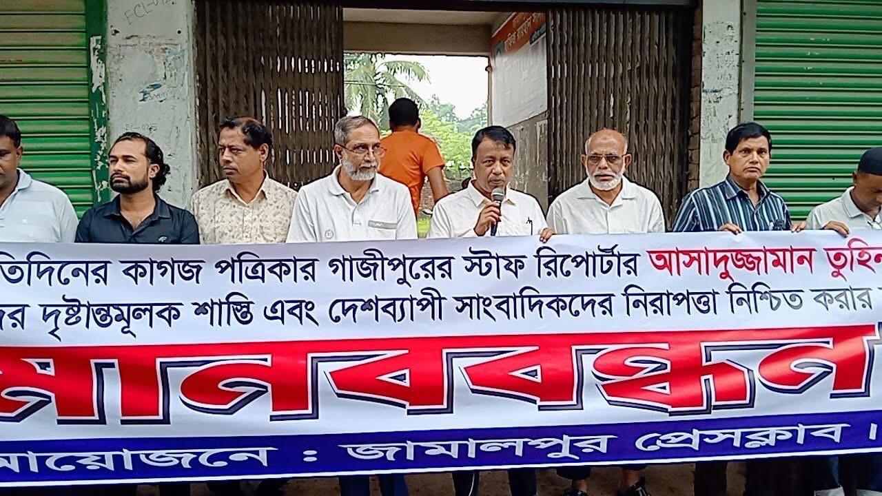 দৈনিক প্রতিদিনের কাগজ পত্রিকার গাজীপুরের স্টাফ রিপোর্টার আসাদুজ্জামান তুহিন হত্যাকারীদের দৃষ্টান্তমূলক শাস্তি এবং সারাদেশে সাংবাদিকদের নিরাপত্তা নিশ্চিতের দাবিতে জামালপুরে মানববন্ধন অনুষ্ঠিত হয়েছে।