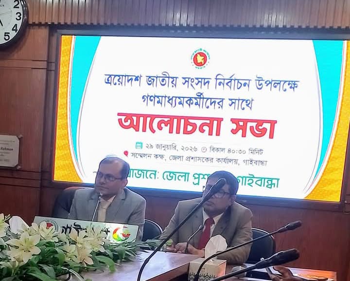 ত্রয়োদশ জাতীয় সংসদ নির্বাচনকে সামনে রেখে গাইবান্ধা জেলা প্রশাসনের উদ্যোগে গণমাধ্যমকর্মীদের সাথে এক আলোচনা সভা অনুষ্ঠিত হয়েছে। সভাটি জেলা প্রশাসকের কার্যালয়ের সম্মেলন কক্ষে অনুষ্ঠিত হয়।