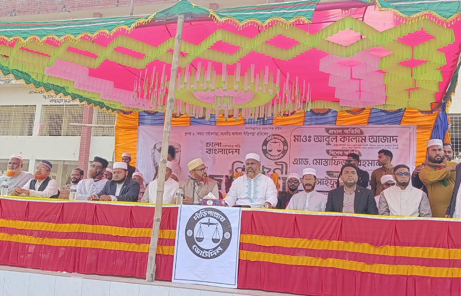 খুলনার কয়রা উপজেলার মহারাজপুর ইউনিয়ন বাংলাদেশ জামায়াতে ইসলামীর উদ্যোগে নির্বাচনী জনসভা অনুষ্ঠিত হয়েছে। শুক্রবার ( ৩০ শে জানুয়ারী ) বিকালে ৩ ঘটিকায় কালনা আমিনিয়া কামিল মাদ্রাসা মাঠে উক্ত নির্বাচনী জনসভা অনুষ্ঠিত হয়। উক্ত নির্বাচনী জনসভায় প্রধান অতিথি হিসেবে উপস্থিত ছিলেন ১১ দলীয় নির্বাচনী জোটের খুলনা ৬ এর দাঁড়িপাল্লার প্রার্থী মাওলানা আবুল কালাম আজাদ। প্রধান অতিথির বক্তব্যে মাওলানা আবুল কালাম আজাদ বলেন, কয়রা উপজেলার সাধারণ মানুষ দীর্ঘদিন যাবৎ আধুনিক নাগরিক সুযোগ-সুবিধা থেকে বঞ্চিত। কয়রার আপামর জনসাধারণের দীর্ঘদিনের প্রাণের দাবি এই জনপদকে পৌরসভা হিসেবে ঘোষণা করা হোক। আগামী ত্রয়োদশ জাতীয় সংসদ নির্বাচনে দাঁড়িপাল্লা প্রতীক বিজয়ী হলে আমরা ইনশাআল্লাহ অগ্রাধিকারের ভিত্তিতে কয়রাকে পৌরসভায় রূপান্তর করব। কয়রাকে পৌরসভা করা এখন আর কেবল বিলাসিতা নয়, বরং সময়ের দাবি। একটি আধুনিক পৌরসভার মাধ্যমে আমরা উন্নত যোগাযোগ ব্যবস্থা, মানসম্মত স্যানিটেশন, বর্জ্য ব্যবস্থাপনা এবং ঘরে ঘরে সুপেয় পানি পৌঁছে দিতে চাই। স্বাস্থ্য ও শিক্ষা খাতের আমূল পরিবর্তন ঘটিয়ে উপকূলীয় এই জনপদকে মডেল হিসেবে গড়ে তোলা হবে। মহারাজপুর ইউনিয়ন আমীর মাস্টার সাইফুল্লাহ হায়দারের সভাপতিত্বে ও জামায়াত নেতা মোনায়েম বিল্লাহের পরিচালনায় বিশেষ অতিথি হিসেবে বক্তব্য রাখেন, খুলনা জেলা জামায়াতের সহকারী সেক্রেটারী এ্যাডভোকেট মোস্তাফিজুর রহমান। অন্যান্যদের মধ্যে বক্তব্য রাখেন, খুলনা জেলা শ্রমিক কল্যাণ ফেডারেশনের সহ-সভাপতি আবুল কালাম আজাদ , কয়রা উপজেলা জামায়াতে ইসলামীর আমীর মাওলানা মিজানুর রহমান, জাতীয় নাগরিক পার্টি এনসিপির খুলনা জেলার সদস্য এ্যাডভেকেট মোঃ আবুবকর সিদ্দিক, নায়েবে আমীর মাওলানা রফিকুল ইসলাম, সোনাডাঙ্গা থানা আমীর শহিদুল্লাহ, ইসলামী ছাত্রশিবিরের খুলনা জেলা দক্ষিণের সভাপতি আবু জার গিফারী প্রমূখ।