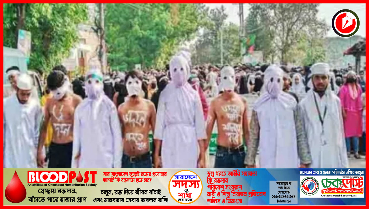 দিনাজপুরে ছয় দফা দাবি আদায় ও কুমিল্লায় আন্দোলনরত শিক্ষার্থীদের ওপর হামলার প্রতিবাদে কাফনের কাপড় পরে মিছিল করেছে পলিটেকনিক শিক্ষার্থীরা।