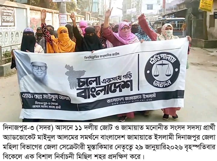 বৃহস্পতিবার (২৯ জানুয়ারি ২০২৬) বিকেলে বাংলাদেশ জামায়াতে ইসলামী দিনাজপুর জেলা মহিলা বিভাগের আয়োজনে এ নির্বাচনী মিছিলটি অনুষ্ঠিত হয়। বিকেল সাড়ে ৩টায় শহরের পাহাড়পুরস্থ জেলা জামায়াত কার্যালয় থেকে মিছিলটি শুরু হয়। প্রায় চার শতাধিক নারী কর্মীর অংশগ্রহণে মিছিলটি দিনাজপুর শহরের প্রধান প্রধান সড়ক প্রদক্ষিণ করে গুরুত্বপূর্ণ পয়েন্ট লিলির মোড় ও হাসপাতাল মোড় অতিক্রম করে দিনাজপুর বড় মাঠে গিয়ে শেষ হয়।