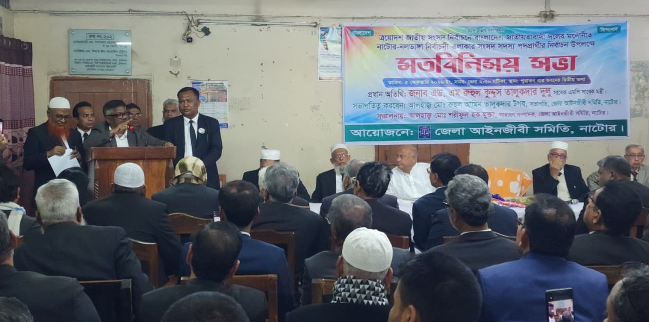 ত্রয়োদশ জাতীয় সংসদ নির্বাচনকে সামনে রেখে বাংলাদেশ জাতীয়তাবাদী দলের মনোনীত নাটোর–নলডাঙ্গা নির্বাচনী এলাকার সংসদ সদস্য পদপ্রার্থীর নির্বাচন উপলক্ষে এক গুরুত্বপূর্ণ মতবিনিময় সভা অনুষ্ঠিত হয়েছে। বুধবার (৫ ফেব্রুয়ারি ২০২৬) দুপুর ২টা ৩০ মিনিটে নাটোর কোর্ট চত্বরে অবস্থিত পুরাতন উকিলবার ভবনের দ্বিতীয় তলায় এই মতবিনিময় সভার আয়োজন করা হয়।