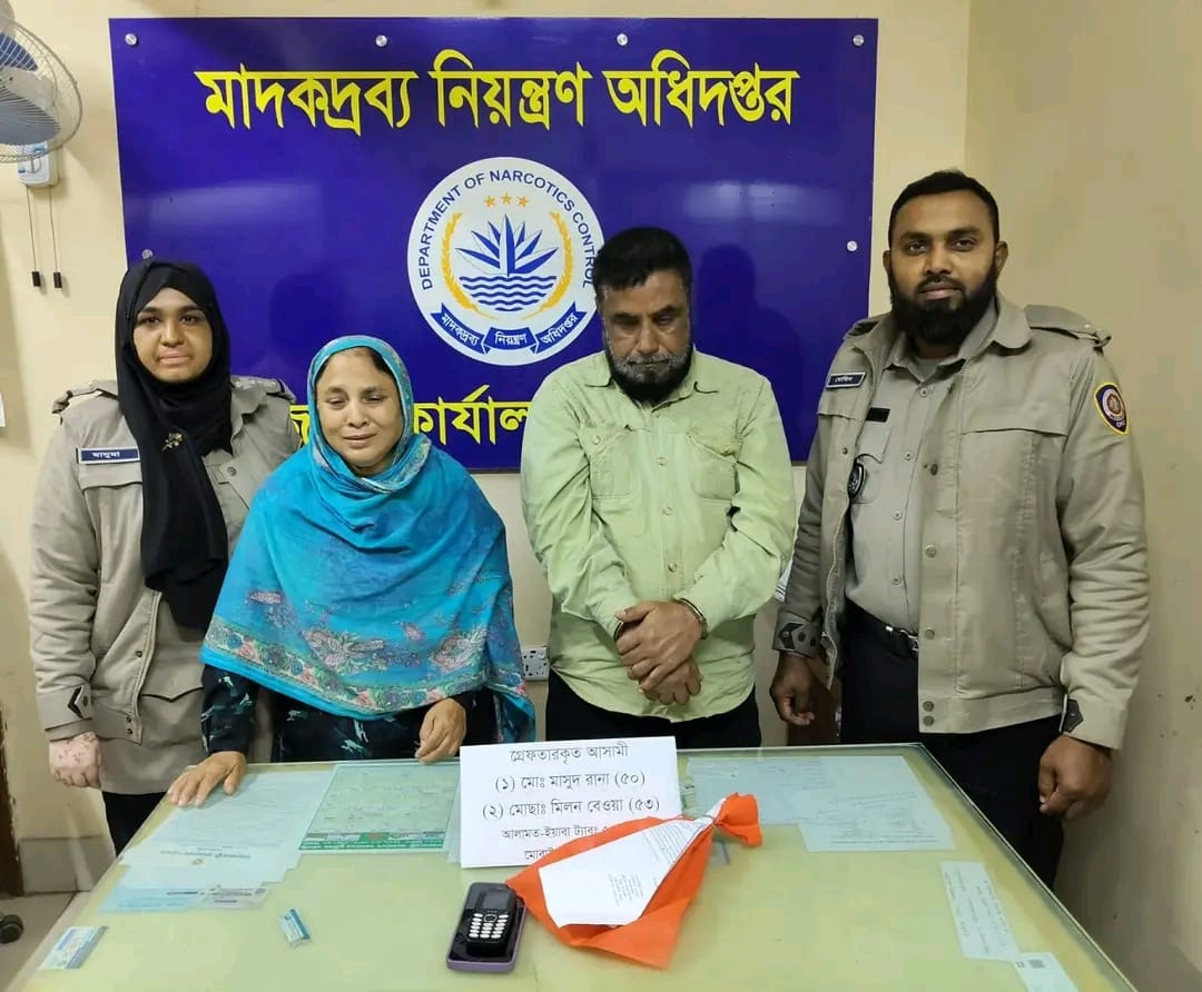 গ্রেফতারকৃতরা হলেন, শেরপুর উপজেলার মির্জাপুর ইউনিয়নের ভাদরা গ্রামের মৃত মোয়াজ্জেম হোসেনের ছেলে মাসুদ রানা ও ধনুট উপজেলার চার ধনুর গ্রামের মৃত ভুলুর স্ত্রী মিলন দেওয়া (৫৩)। মাদকদ্রব্য নিয়ন্ত্রণ অধিদপ্তর, বগুড়া জেলা কার্যালয়ের পরিদর্শক মোঃ সামসুল আলম বাদী হয়ে গ্রেফতারকৃতদের বিরুদ্ধে শাজাহানপুর থানায় মাদকদ্রব্য নিয়ন্ত্রণ আইনে একটি নিয়মিত মামলা দায়ের করেছেন। ডিএনসি বগুড়া কর্তৃপক্ষ জানিয়েছে, মাদকাসক্তিমুক্ত বাংলাদেশ গড়ার লক্ষ্যে মাদকের বিরুদ্ধে তাদের এই জিরো টলারেন্স নীতি ও অভিযান অব্যাহত থাকবে। তানজিল সরকার উপজেলা প্রতিনিধি শেরপুর, বগুড়া