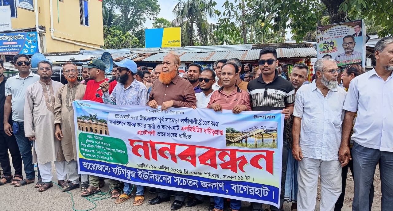বাগেরহাটে লক্ষ্মীখালী ব্রিজের নির্মাণকাজ শুরুর দাবিতে মানববন্ধন, এলজিইডির প্রকৌশলীকে প্রত্যাহারের দাবি