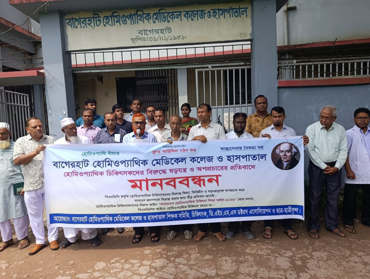 সোমবার (১ সেপ্টেম্বর) বাগেরহাট হোমিওপ্যাথিক মেডিকেল কলেজ ও হাসপাতালের উদ্যোগে কলেজ প্রাঙ্গণে এ মানববন্ধন অনুষ্ঠিত হয়। এতে শিক্ষক, চিকিৎসক, ডিএইচএমএস ডিগ্রিধারী ও শিক্ষার্থীরা অংশ নেন।