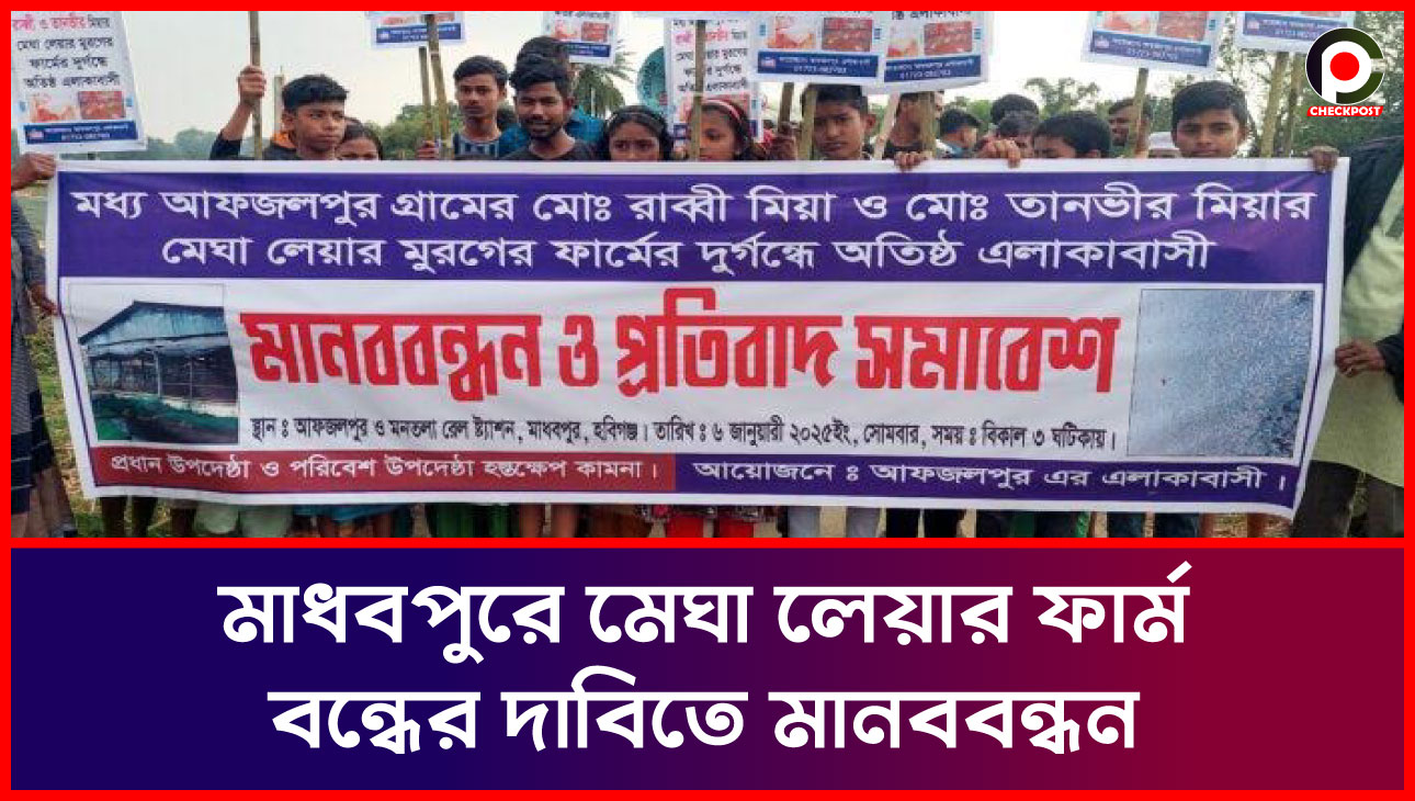 মাধবপুরের বহড়া ইউনিয়নের আফজলপুর গ্রামে অবস্থিত বাণিজ্যিক মেঘা লেয়ার ফার্মের অবৈধ কার্যক্রম বন্ধ করার দাবিতে এলাকার জনগণ, পরিবেশবাদী সংগঠন এবং সচেতন মহল মানববন্ধন কর্মসূচি পালন করেছে।