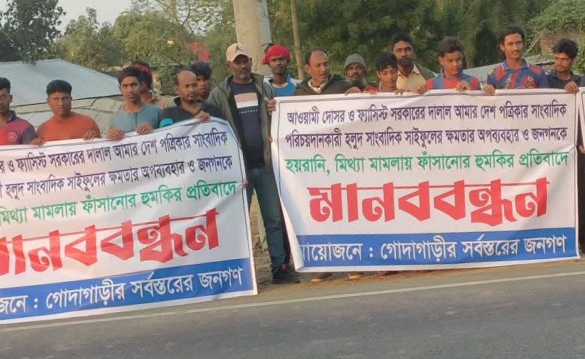 রাজশাহীর গোদাগাড়ীতে মিথ্যা সংবাদ প্রচার করে অর্থ আদায়ের অভিযোগে এক সাংবাদিকের বিরুদ্ধে মানববন্ধন করেছে স্থানীয় জনতা। সোমবার (১২ জানুয়ারি) বিকেল ৩টায় উপজেলার সাহাব্দিপুর মোড় এলাকায় এ মানববন্ধন অনুষ্ঠিত হয়।