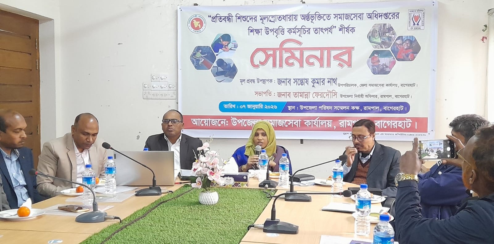 বাগেরহাটের রামপালে প্রতিবন্ধী শিশুদের শিক্ষা উপবৃত্তি বিষয়ক এক সেমিনার অনুষ্ঠিত হয়েছে। “প্রতিবন্ধী শিশুদের মূলধারায় অন্তর্ভুক্তিতে সমাজসেবা অধিদপ্তরের শিক্ষা উপবৃত্তি কর্মসূচির তাৎপর্য” শীর্ষক এ সেমিনারের আয়োজন করে উপজেলা সমাজসেবা দপ্তর।