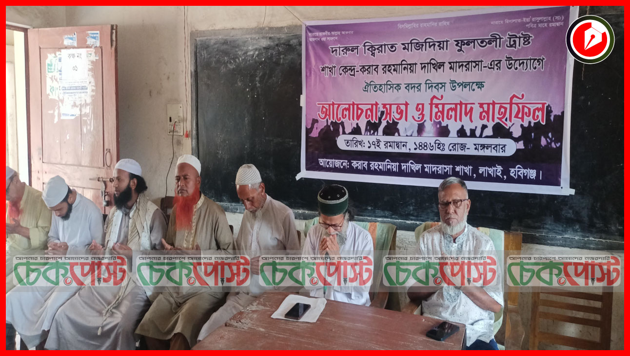 লাখাইয়ে দারুল ক্বিরাত মাজিদিয়া ফুলতলী ট্রাস্টের করাব রহমানিয়া দাখিল মাদ্রাসা শাখার উদ্যোগে ঐতিহাসিক বদর দিবস উপলক্ষে আলোচনা সভা ও মিলাদ মাহফিল অনুষ্ঠিত হয়েছে।