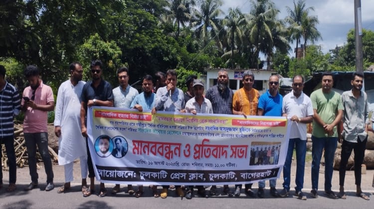 প্রতিদিনের কাগজের সাংবাদিক আসাদুজ্জামান তুহিন হত্যাকারীদের ফাঁসি এবং বাংলাদেশের কাগজ পত্রিকার সাংবাদিক আনোয়ার হোসেনসহ দেশব্যাপী সাংবাদিক নির্যাতনের প্রতিবাদে বাগেরহাটের চুলকাটি প্রেসক্লাবের উদ্যোগে মানববন্ধন ও প্রতিবাদ সমাবেশ অনুষ্ঠিত হয়েছে।
