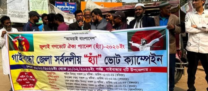 গাইবান্ধা জেলার সাদুল্লাপুর উপজেলায় আসন্ন গণভোটে "হ্যাঁ" ভোটের পক্ষে ব্যাপক প্রচারণা চালানো হচ্ছে। "আমরাই বাংলাদেশ জুলাই গণভোট ঐক্য প্যানেল (হ্যাঁ)" নামে একটি সর্বদলীয় প্ল্যাটফর্মের ব্যানারে এই ক্যাম্পেইন পরিচালিত হচ্ছে, যা জুলাই মাসের গণঅভ্যুত্থান ও জুলাই জাতীয় সনদের আদর্শ বাস্তবায়নের লক্ষ্যে গঠিত।