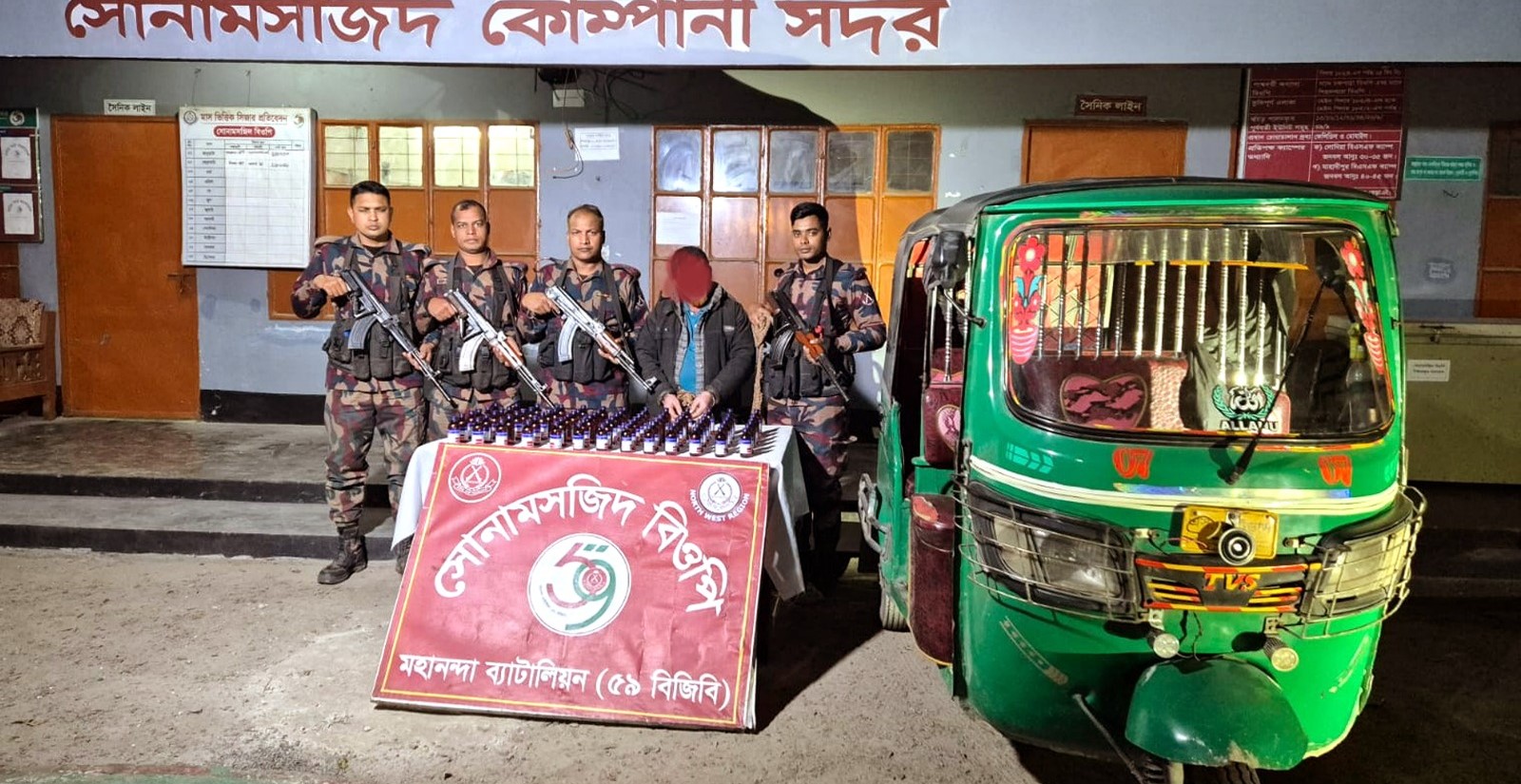 গোপন সংবাদের ভিত্তিতে আজ ১৫ ফেব্রুয়ারি ২০২৬ তারিখ রাত ৯:০০ টার সময় সোনামসজিদ বিওপি’র একটি চৌকস টহল দল সীমান্ত পিলার ১৮৪/৪-এস হতে আনুমানিক ০১ কিঃ মিঃ বাংলাদেশের অভ্যন্তরে উপজেলার কয়লাবাড়ী গ্রামস্থ নতুন ট্রাক টার্মিনাল এলাকায় এ অভিযান পরিচালনা করে। উক্ত অভিযানে টহল দল ০১ জন আসামী মোঃ ফরিদ (৪৫), পিতা-মৃত আব্দুল জব্বার, গ্রাম-চককৃর্ত্তি, পোষ্ট-কানসাট, থানা-শিবগঞ্জ, জেলা-চাঁপাইনবাবগঞ্জকে ফেন্সিডিল এর বিকল্প ৭৮ বোতল ভারতীয় নেশাজাতীয় Eskuf DX সিরাপ এবং ০১টি সিএনজি (TVS) সহ আটক করতে সক্ষম হয়। বিজিবি’র পক্ষ হতে আটক আসামীর বিরুদ্ধে মামলা করতঃ নেশাজাতীয় সিরাপ এবং সিএনজি শিবগঞ্জ থানায় হস্তান্তরের কাজ চলমান। প্রসঙ্গত, এই ব্যাটালিয়ন বিগত ০৩ মাসে সীমান্তে অভিযান চালিয়ে এ যাবৎ ৩,১০০ বোতল ফেন্সিডিল এর বিকল্প কয়েক ধরনের নেশাজাতীয় সিরাপ আটক করেছে।