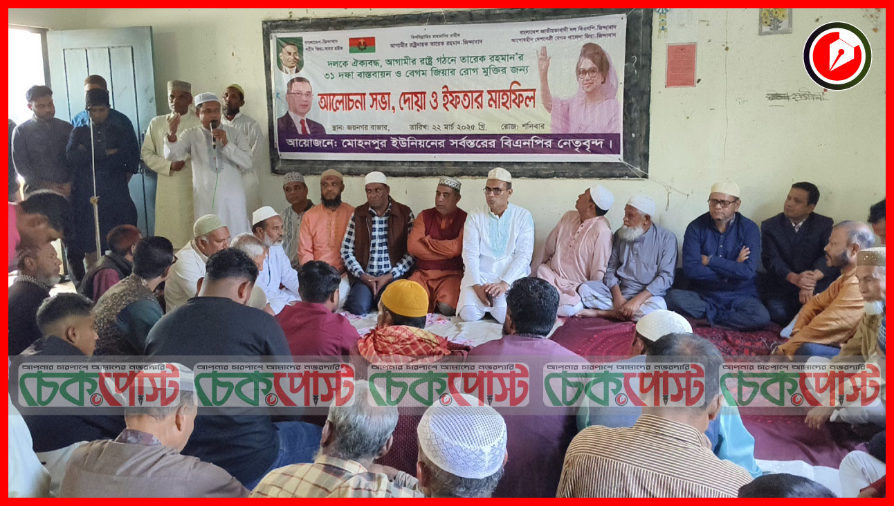 ২১ মার্চ, শুক্রবার বিকেলে সুনামগঞ্জ সদর উপজেলার মোহনপুর ইউনিয়ন বিএনপি, অঙ্গ ও সহযোগী সংগঠনের উদ্যোগে জয়নগর বাজার হাজী গনি বক্স উচ্চ বিদ্যালয়ের হলরুমে এই আয়োজনটি অনুষ্ঠিত হয়। সভায় সভাপতিত্ব করেন মোহনপুর ইউনিয়ন বিএনপির সাবেক সহ-সভাপতি আজিজুর রহমান, এবং পরিচালনা করেন ইউনিয়ন বিএনপি নেতা আব্দুল কাইয়ুম।